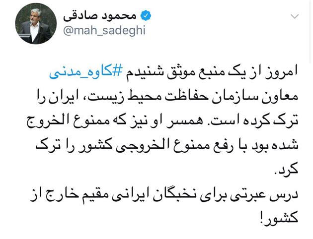 به گزارش خبرنگار سایت خبری محیط زیست ایران (IENA)، کاوه مدنی که پس از تعطیلات نوروزی به سازمان حفاظت محیط زیست نرفته بود، پس از توییت محمود صادقی - نماینده تهران در مجلس که نوشته بود "از منبع موثقی شنیدم که کاوه مدنی ایران را ترک کرده است."، صبح امروز در کانال تلگرامی خود تلویحا رفتنش را از سازمان محیط زیست تایید و این اقدام را خواسته خود عنوان کرده است.