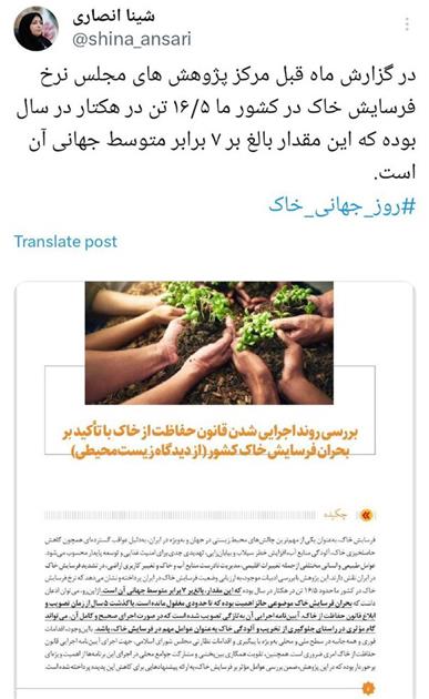 رییس سازمان حفاظت محیط زیست نوشت: بر اساس گزارش ماه قبل مرکز پژوهشهای مجلس، نرخ فرسایش خاک در کشور ما بالغ بر هفت برابر متوسط جهانی آن است.